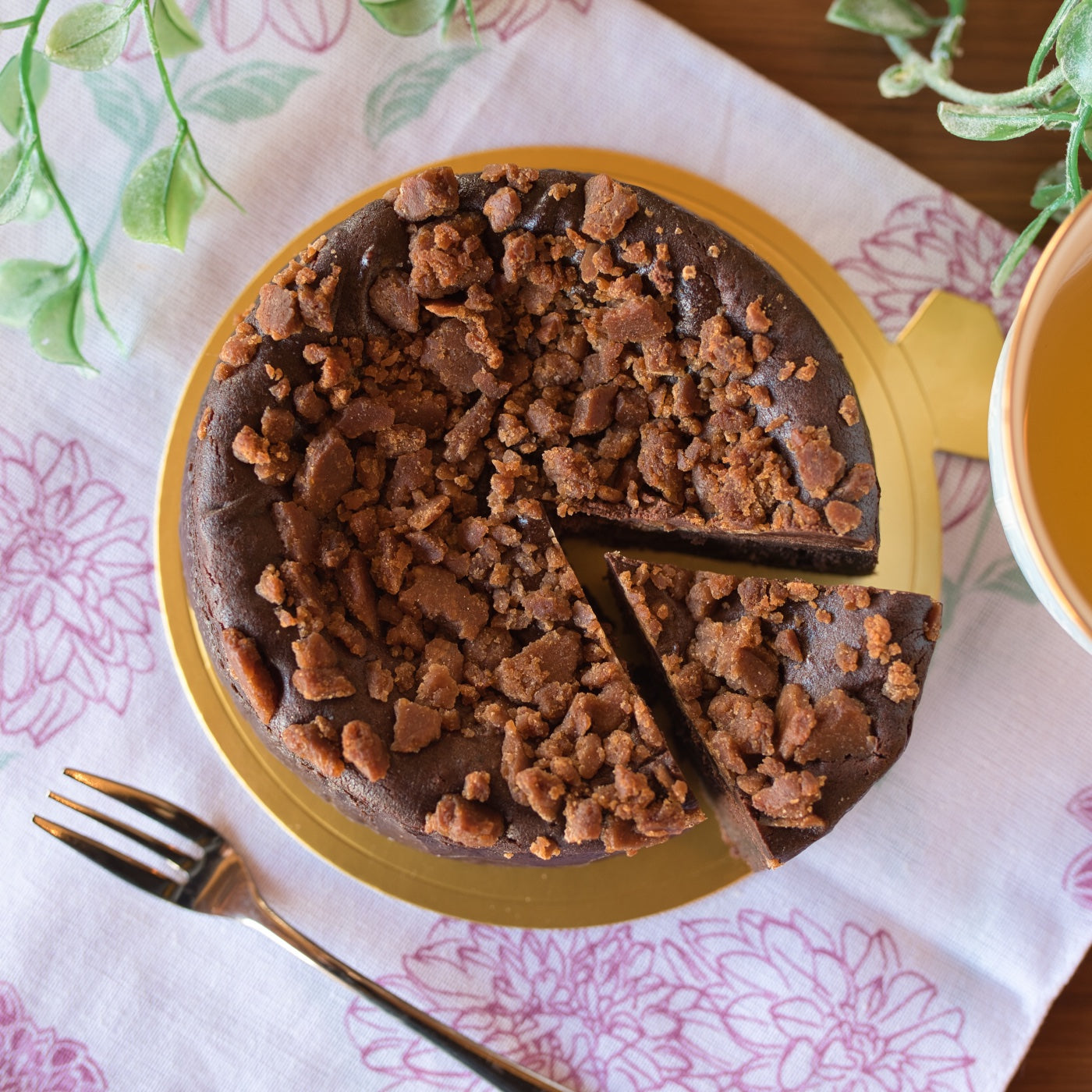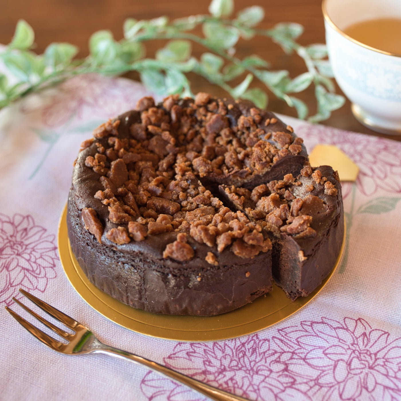 この濃厚な生チョコレートのような味わいに、バターや生クリームも使ってないのに?と驚かれるはず。表面にはココアクランチをたっぷりかけて、食感の楽しさを追求しました。
