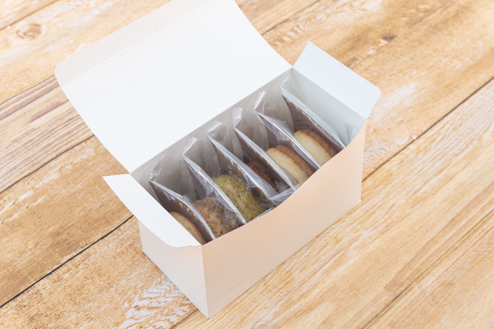 直径約7.5cm/50g/6個 プレーン2、ココア1、抹茶1、紅茶1、チョコクラッシュ1